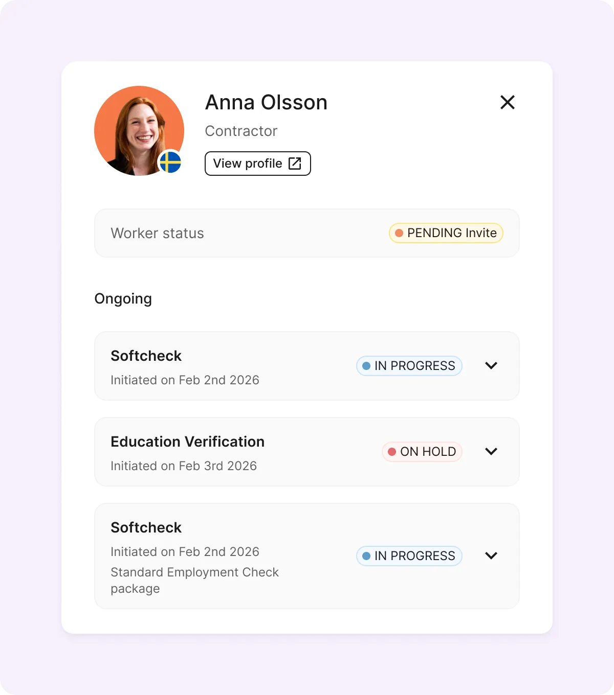 Run background checks for contractors, EOR employees, direct employees, global payroll, and PEO workers. Request during onboarding, for existing workers, or without an active contract.